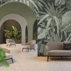 Savage to wzór inspirowany sztuką, w kolekcji Nature. Stałe modny motyw liści palmy, bananowca i miłorzębu w stonowanej, ciemnej zieleni, pozwoli na kreację oazy spokoju w niejednym wnętrzu. Wzór będzie pasował zarówno do sypialni, salonu, kuchni, łazienki, czy pokoju dziecka. Pozwoli wyciszyć się w hotelowym wnętrzu lub restauracji, a także nada niezwykłego klimatu klatkom schodowym.