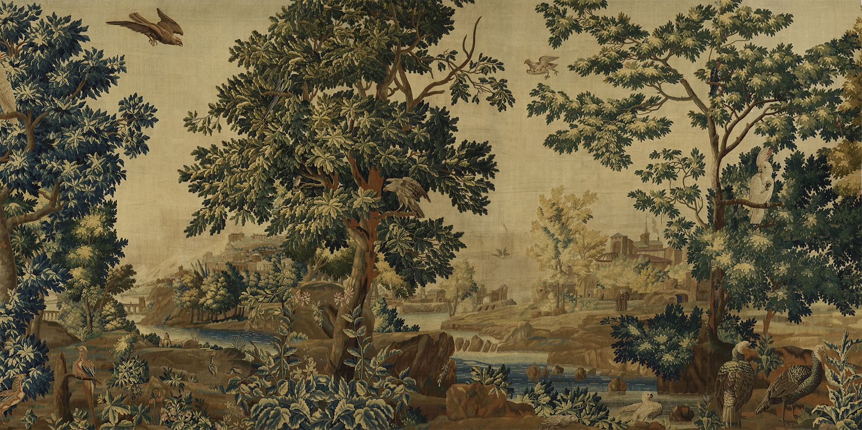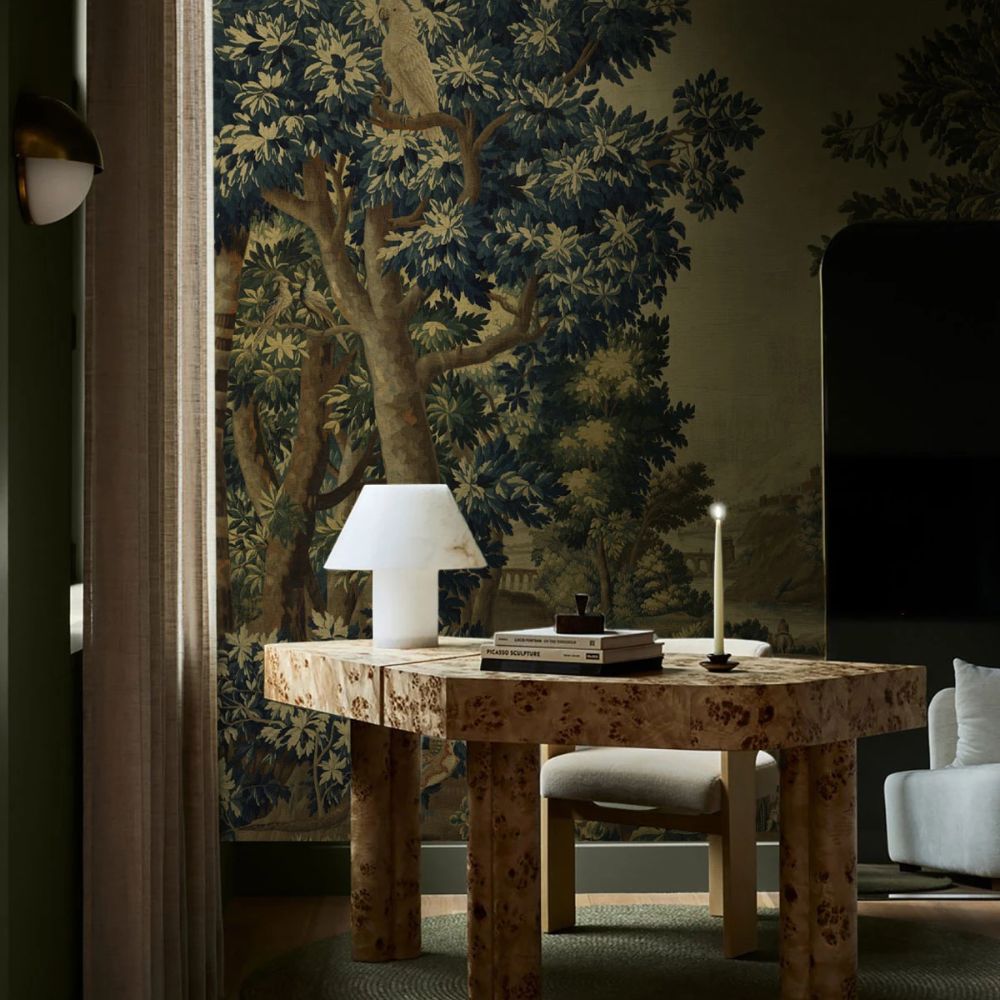 Whispering Garden to tapeta inspirowana dawnymi gobelinami, pełna delikatnych niuansów i przygaszonych barw. Przedstawia gęsty, bujny ogród, w którym między gałęziami kryją się ptaki i postaci, tworząc scenerię niczym z baśni. To dekoracja, która wprowadza do wnętrza atmosferę spokoju, tajemnicy i klasycznej elegancji.