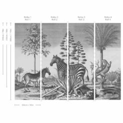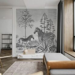 Monochromatyczny mural inspirowany techniką drzeworytu. Przedstawiona rycina prezentująca zebry w asyście Agawy na tle pejzażu z drzewami. Wzór tak uniwersalny, że można ozdobić nim praktycznie każde wnętrze.